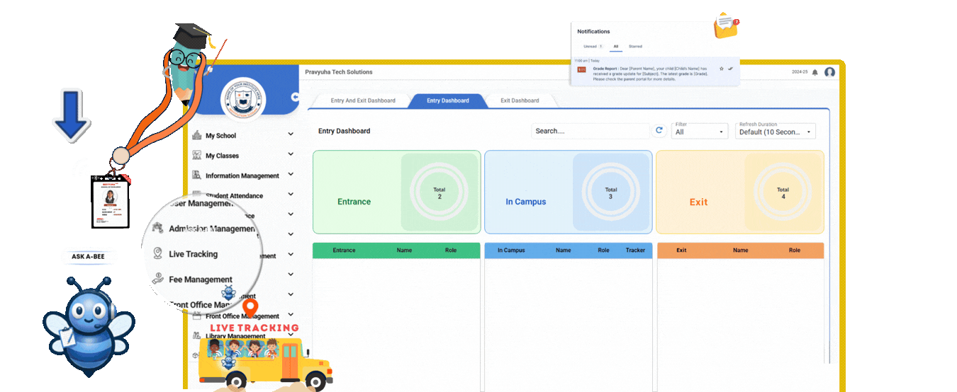 A complete set of school automation tools designed to streamline all aspects of school operations from admissions to alumni. By automating routine tasks, enhancing communication, and ensuring a seamless flow of operations, BeeVyuha® streamlines both admin and academic processes.