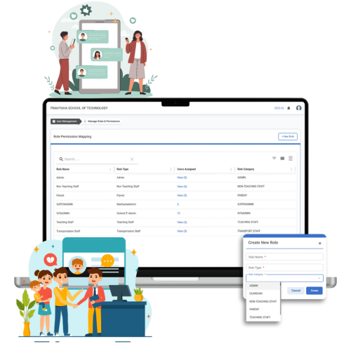 Assign predefined roles such as Teacher, Parent, Student, and Admin. -